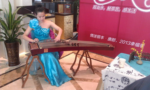 2013年3月23日-24日,銀豐·唐郡茶文化節活動持續火熱上演,精雅的茶案、細膩的紫砂茶具、飄蕩四溢的茶香,讓客戶一走進營銷中心就能感受到空氣里都彌漫著一種清靜悠然的氣氛。為了給當天的來訪客戶帶來一份舒緩、安心的氛圍,活動邀請了知名古箏演奏師現場表演,讓客戶度過了一個傳統茶文化與古典音樂共鳴的幸福周末。