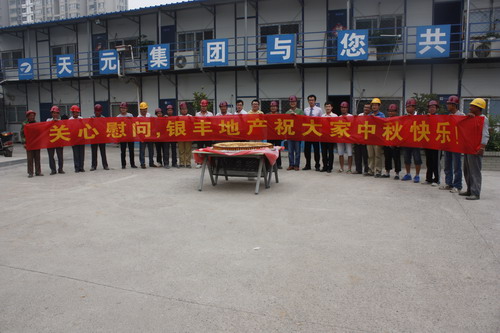 9月8日是中國傳統的中秋佳節,在這個本應闔家團圓的日子里,卻依然有一群人,為了能讓業主早日住進自己的新房里,而默默堅守在自己的工作崗位上。他們,就是銀豐·唐郡項目的一線建設工人。銀豐地產集團唐冶公司秉承一貫的人文關懷之理念,在中秋節這天為工地工友送上一個半噸重的超級月餅,并以這種方式表達對工友的關愛之情,讓堅守在工地上的他們也能過個溫暖的中秋節。