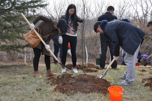 植樹現場,熱鬧非凡。大家齊心協力、鼓足干勁,揮動鐵鍬、鏟土填坑,植出一株株新苗。一陣忙碌之后,百余棵新栽的櫻桃樹、核桃樹、蘋果樹等挺立在三月的和煦春風里。
