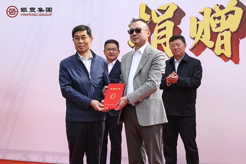 嶗山區(qū)慈善總會會長張永波向銀豐集團副總裁兼銀豐地產(chǎn)集團董事長李斌頒發(fā)捐贈證書。